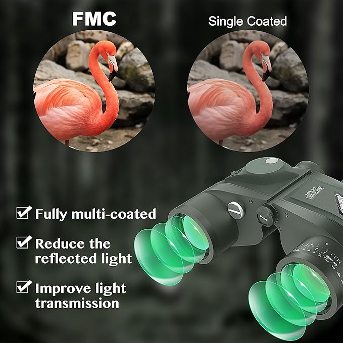 - BAK4 Binoculars: High refractive index BAK4 Porro Prism eliminates the stray light and improves color reproduction to 99.99%. Green FMC anti-reflective coating reduces the reflected light in the objective lens and improves light transmission, image brightness and image sharpness.