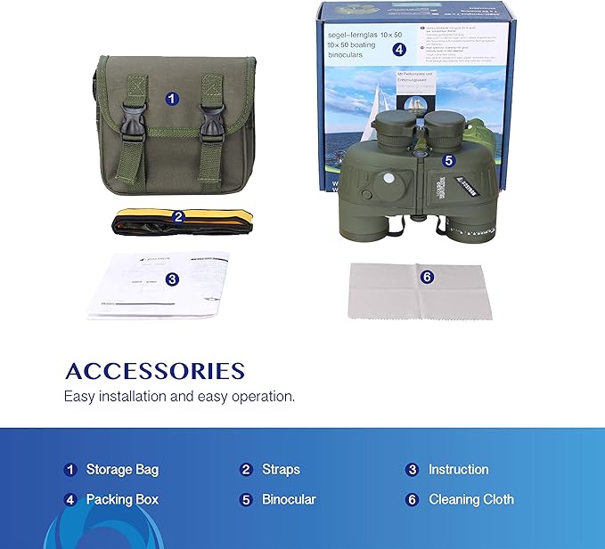 - Built-in illuminated compass for direction location, perfect for low light conditions, and a rangefinder for calculate the distance and size of the object on the left eyepiece directly. Perfect marine binoculars include batteries, a ruler and a compass illuminated by the light button, provides the maximum brightness of the image even in low light conditions(not totally dark), such as at dusk and dawn.