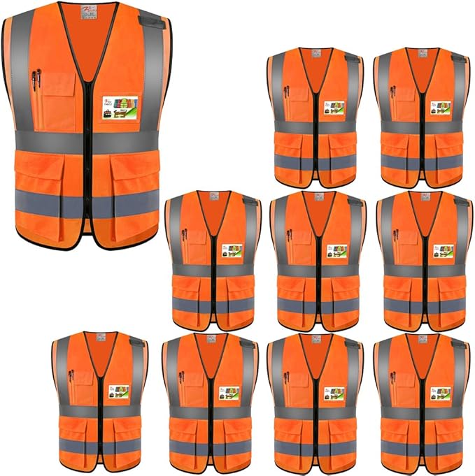 zojo High Visibility Safety Vests With Pockets, Wholesale Reflective Vest for Outdoor Works, Cycling, Jogging, Walking,Sports - Fits for Men and Women (Pack of 10, XXL-Orange)