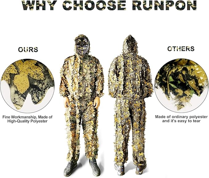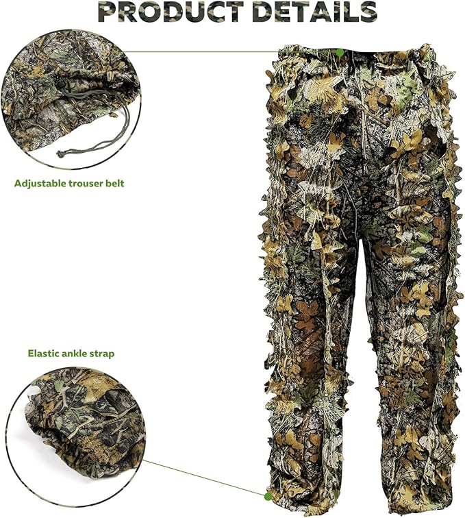 - Ghillie Suit Material - 3D leafy suit is made of breathable and comfortable polyester fabric and lightweight polypropylene yarn, comfortable to wear, noiseless, it allows people to blend into outer environment durable. Ghillie suit for hunting uses a leaf-based camouflage pattern, 3D leaves can sway in the wind which maximizes the realistic look of the ghillie suit.