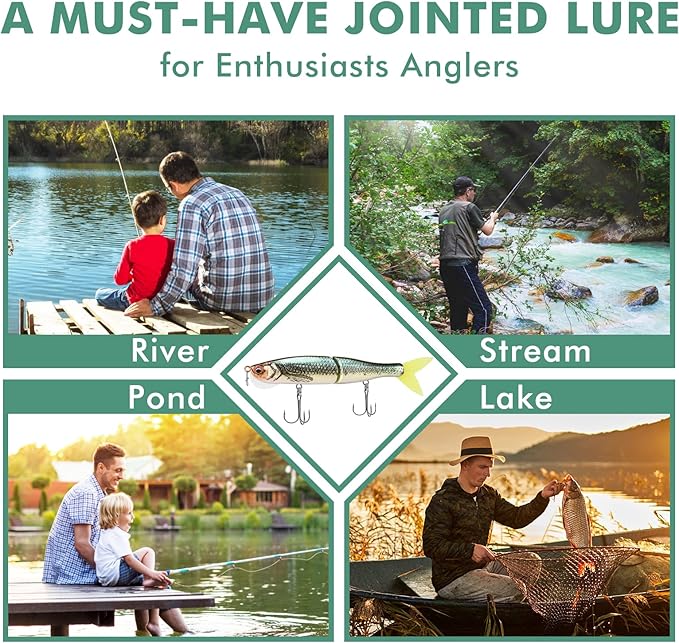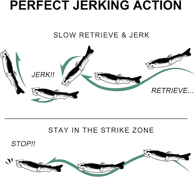 - VERTICAL TONGUE DESIGN - TRUSCEND's new vertical tongue design prevents the glide baits lures from swaying or rolling, and can maintain a stable swimming action in resistive water currents. Designed with jointed body, the jointed swimbait can move flexible in water. In addition, life-like swimming actions make it attracting more catches and provoking predator fish to strike.