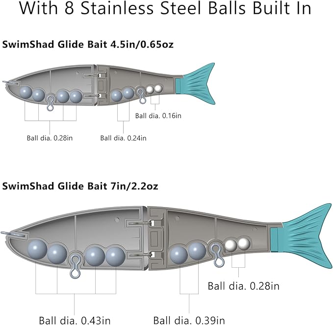 - With eight stainless steel balls (ball dia. 0.28in, 0.24in and 0.16in) built in, along the bottom of the swim bait, to keep balance and for further distance casting, and the steel balls also make the lure noisy which will be a big factor especially when water clarity is low, rather than lure action or color