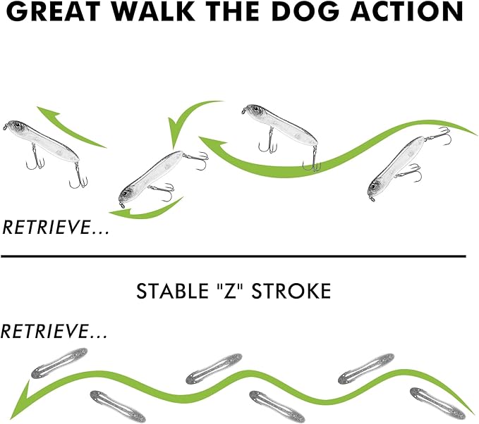 - Lifelike Design and Loud Sound Attraction - Classic pencil lure with 3D eyes and laser effect scale. Attract fish by reflecting lights from all directions. With it's one knock cadence rattle, this unique pencil lures trigger exciting top water strikes, draw predators' attention, convince fish to strike.