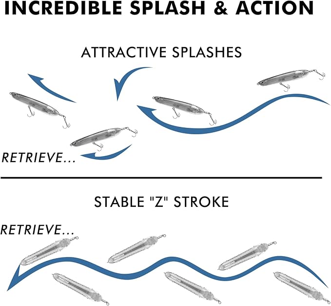 - Rear-Weighted Design - The popper baits possess precise weights within the tail section, produces potent action, delivers long and bullet-like casts even when fishing in windy conditions.It makes walking the dog effortless and allows the lure to sit tail-down for a splashing, popping action that predator fish can't resist.