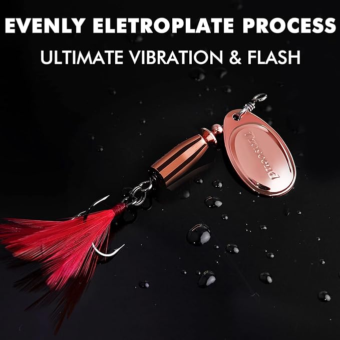 - Vigorous Spinning Action - This rooster tail fishing lures features a Unique free-spinning blade, uses an unconventional hand-made electroplated technique to retain the reflectivity of the metals and attract fish more easily; And its vigorous spinning action produces powerful sonic vibrations that call out to every fish in different areas
