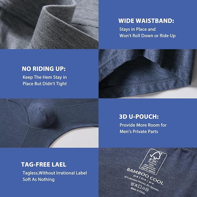 • HIGH-QUALITY MATERIAL: Our men's boxer briefs are crafted from 92% bamboo viscose and 8% spandex, offering superior softness, breathability, and moisture-wicking properties. Compared to cotton, they are 20-30% more breathable and 2-3°C cooler, keeping you fresh and comfortable all day long