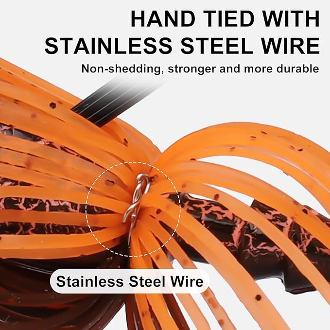 - SUPER STRONG FIXED STRUCTURE - Compared to traditional tying materials, our fishing jigs use a unique stainless steel metal wire tying silicone skirt, which is stronger and more reliable, and is 3 times more durable. In addition, we use a double soft baits trailer keeper. You no longer have to worry about trailer falling off and lures falling apart.