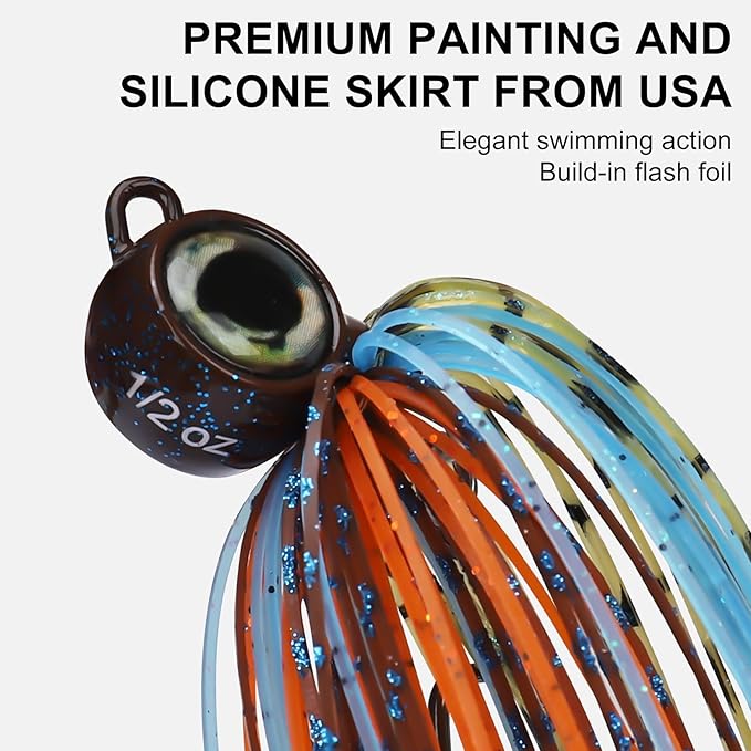 - LIVELY & VIVID SKIRTED BASS JIG - To mesmerize bass with flowing movement, the fishing lures for freshwater finished with a muti-color silicone skirt with flash foil for lively action, which keeps good expansion in the water, produces extra realistic subtle movements and contours even without moving the lure. Plus, we equip the swim jigs with different colors for use in different waters.