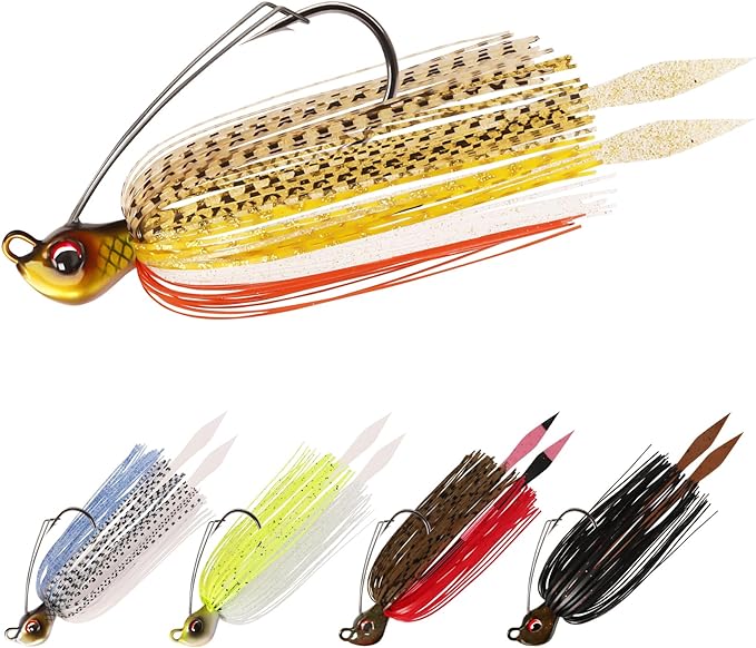 - LIVELY & VIVID SKIRTED BASS JIG - To mesmerize bass with flowing movement, the freshwater bass jigs fishing lures finished with a muti-color silicone skirt with flash foil for lively action, which keeps good expansion in the water, produces extra realistic subtle movements and contours even without moving the lure. Plus, we equip the swimbait with different colors for use in different waters.
