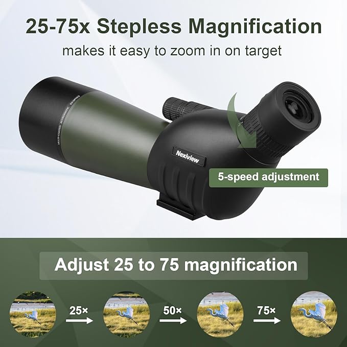 - ⭐【Professional Powerful Spotting Scope】Zoom in on nature with a powerful 25-75x magnification range and ergonomic 45 degree angled eyepiece for comfortable viewing. Perfect for bird watching, hunting, target shooting, and more.