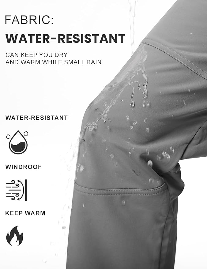 • These snow hiking pants are made of 92% polyester and 8% spandex, which are water-resistant and windproof when it is cold and drizzly outside. If you walk in the small rain, it can help you stay dry for about 10-15 minutes