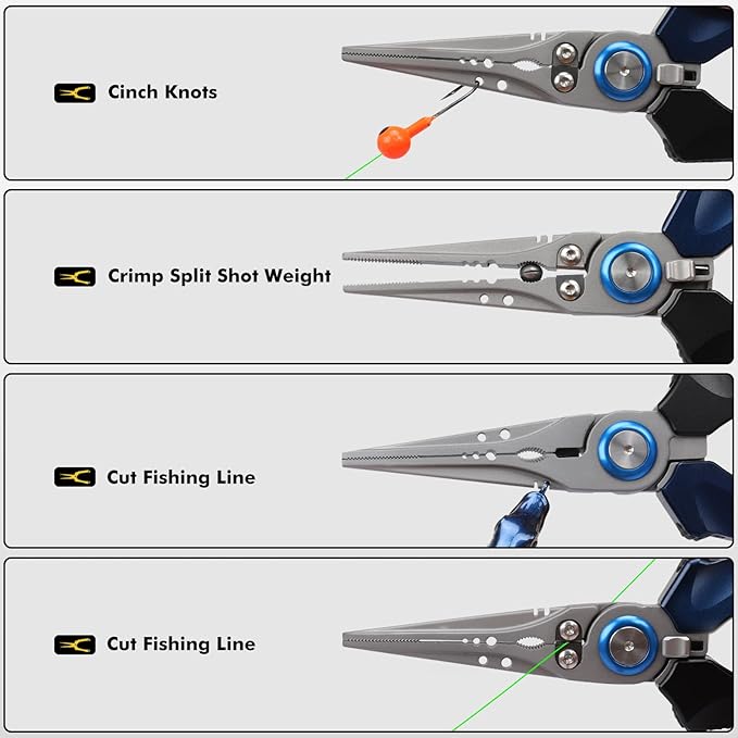 - SHARP AND PRECISE CUTTER - The fishing gear and equipment essentials have a wire cutter with a super tight bite. Super cutting and corrosion resistant Molybdenum Vanadium blades with a special riveting process ensure that the cutter will close completely and work as it should when gripping objects. The fishing line cutter makes it extremely easy to cut the strongest braided line, the heaviest mono leader, the fly line and backing line