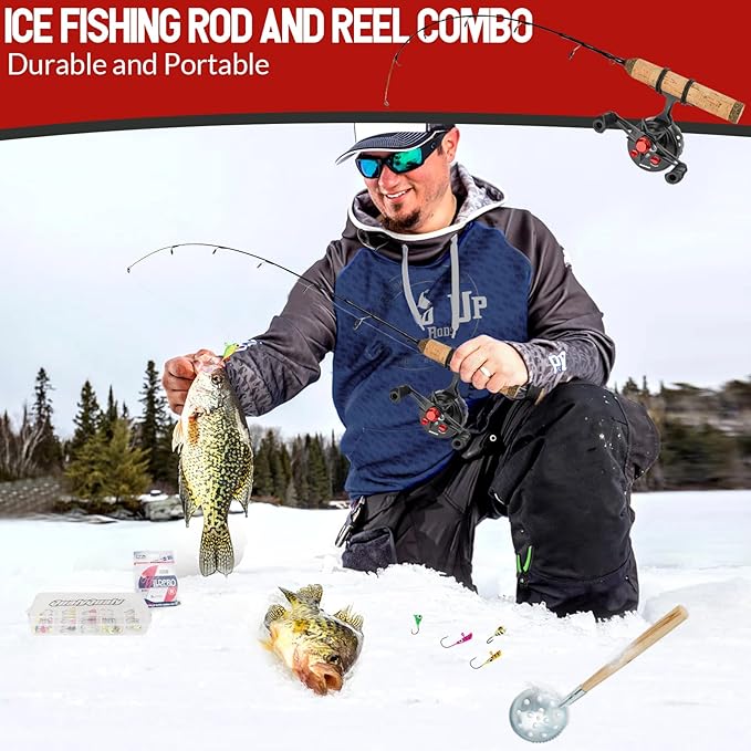 QualyQualy Ice Fishing Rod Reel Combo Complete Set Ice Fishing Gear with Backpack Seat Ice Cleats Ice Fishing Jigs Line Full Ice Fishing Kit 24" 26"