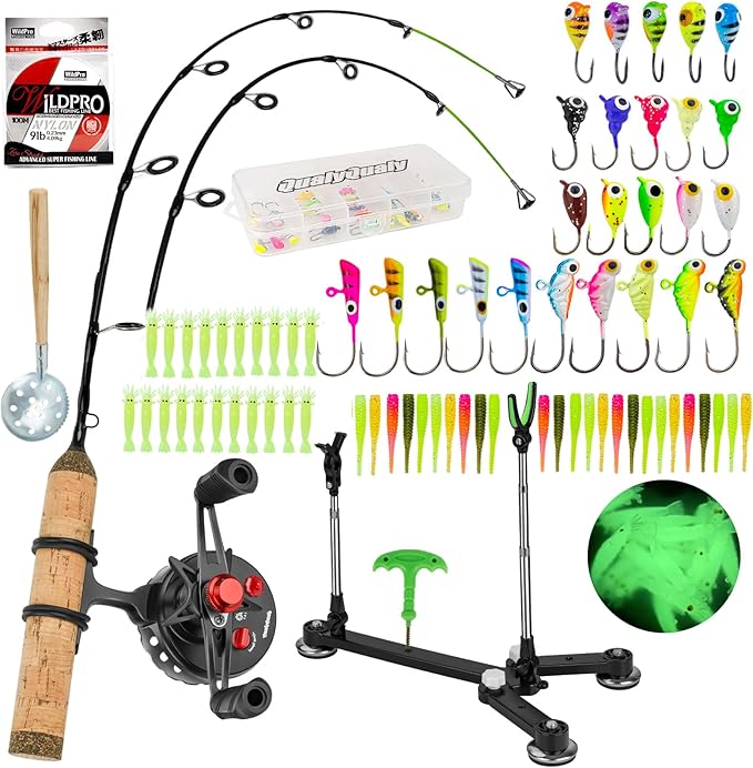 - Full Ice Fishing Combo:In addition to the regular ice fishing rod and reel combo and lures, the QualyQualy Ice Fishing Kit additionally includes an ice fishing holder, an ice scoop, and a 100m spool of line, which is more than enough to handle most of your ice fishing needs.