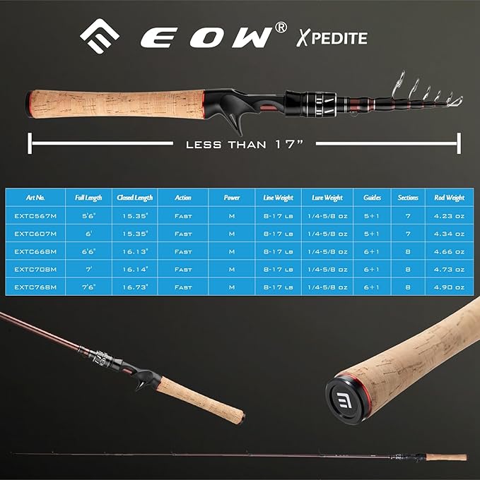 - SUPERIOR QUALITY: EOW XPEDITE telescopic casting rods are made from 24T carbon and epoxy for sensitivity, durability, and high performance. The tips are solid carbon for flexibility. The reel seats are ABS with CNC aluminum parts and the grips are wear-resistant EVA with cork. With these top-notch components, EOW delivers the perfect portable telescopic fishing rod.