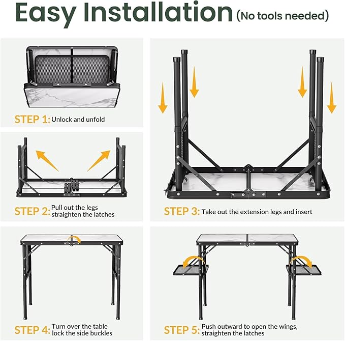 - Simple 5-step Installation (No tools needed). Step 1: Unlock and unfold. Step 2: Pull out the legs and straighten the latches. Step 3: Take out the extension legs and insert. Step 4: Turn over the table and lock the side buckles. Step 5: Push outward to open the wings, straighten the latches. Done. Please refer to the installation steps in the picture.