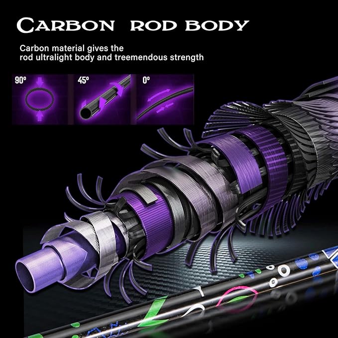 - Featherweight and Durable: Made from high-quality carbon material, this fishing rod is incredibly sturdy yet incredibly lightweight, making it perfect for long hours of fishing without fatigue. Unique Water Transfer Printing: Stand out on the water with the eye-catching water transfer printing design that is both novel and stylish, making your fishing experience even more enjoyable.