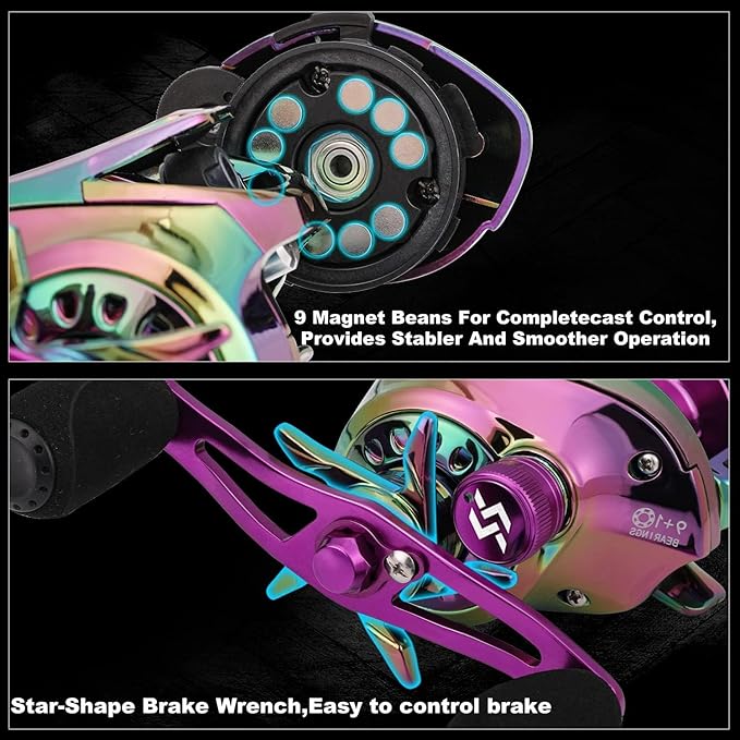 - Amazing Baitcasting Reel: Delivers a smooth fishing experience with a 6.5:1 gear ratio, simple magnetic braking system, equipped with 9+1 ball bearings and rear drag functions, offers durability and strength.