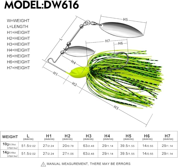 - SPINNERBAIT LURES - Simulation fish head with extra large 3D vivid eyes, flared gills and hard coat paint, the lure undulating skirt attract fish. Weight: 14g/0.5oz. Diving Depth: all swimming layer
