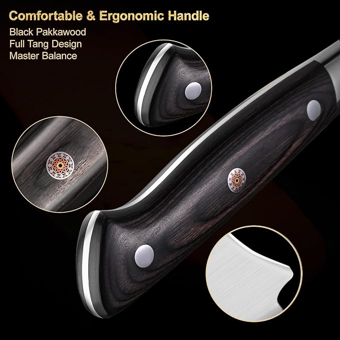 - FULL TANG & PAKKAWOOD HANDLE: Our meat boning knife features a black pakkawood handle with a full tang design complemented by a mosaic pin, tightly integrates the blade and handle, ensuring exceptional strength, comfort, balance, ergonomic and stability. The quality wood handle ensures a professional grip while minimizing fatigue, finger numbness, and discomfort during extended use