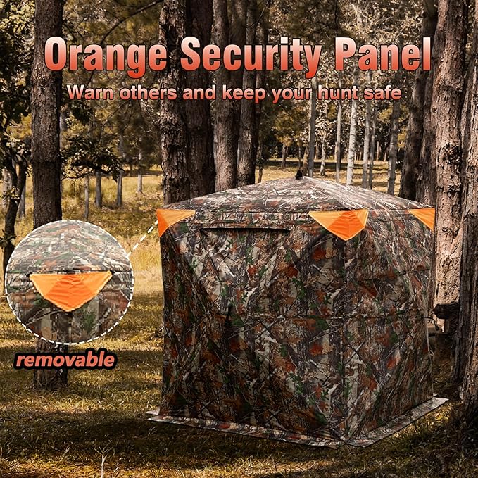 - 【RELIABLE & DURABLE】 Hunting blinds are built with a tough metal hub, reinforced corners, and resilient straps, this turkey blind is built to endure any weather Mother Nature throws your way. hunting tent comes with removable blaze orange safety panels on each of the four corners and make your hunt safer