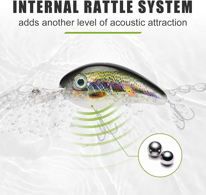 - Premium Materials: The body of bass lure is made of high strength ABS, maintaining the durability of fishing lures and making crankbait pass through many obstacles with higher efficiency. Premium coating process and concave scale design make the lure look more realistic.