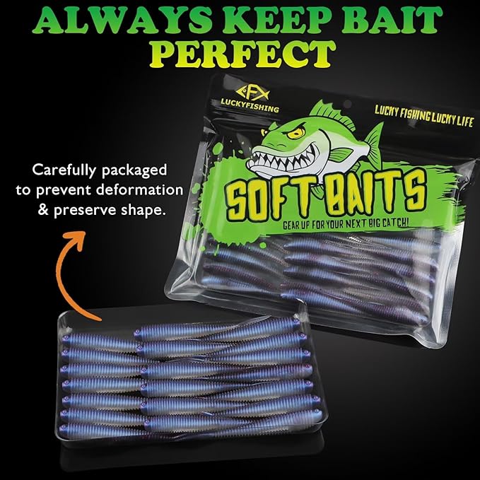 - SOFT BAITS ENGINEERED FOR EVERY STRIKE: Soft Plastic Baits are equipped with strike-triggering colors and subtle shrimp scent, they seem like every fish in the lake wants to eat them. Crafted from durable & premium plastic, Fat & tear-resistant body are built to last. Features Hidden Hook Slot that makes it easy to rig and promotes better hook sets. Try the LUCKYFISHING soft plastic baits on your favorite setups! Take your Lucky Soft Lures, bring back the success.