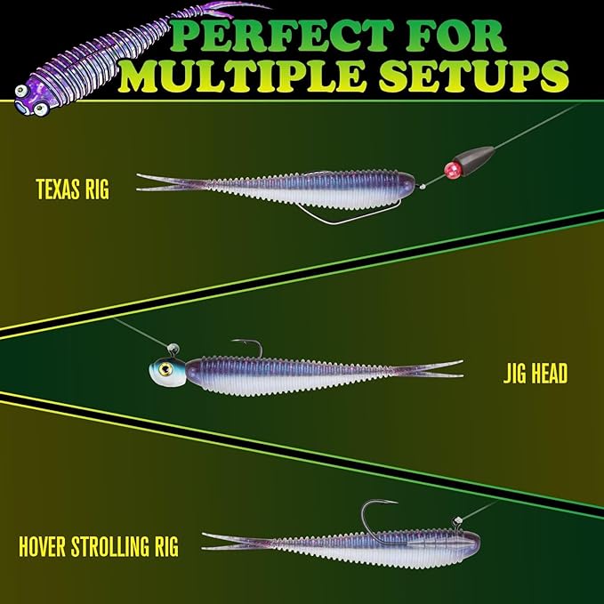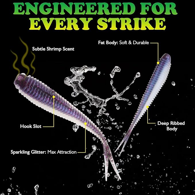 - UNIQUE INNOVATION RIBBED BODAY & FORKED TAIL: Soft Baits are Designed to Swim-Built to Catch. Innovation Deep Ribbed bodies that ripple vibrations through water, creating a tantalizing disturbance that draws fish in from afar. Natural Streamlined Baitfish Profile features a ribbed body design and lively forked tail to create a lifelike action. Slim forked tail adds lifelike motion, expertly mimicking the movements of baitfish while catching attention of even the wariest slabs.