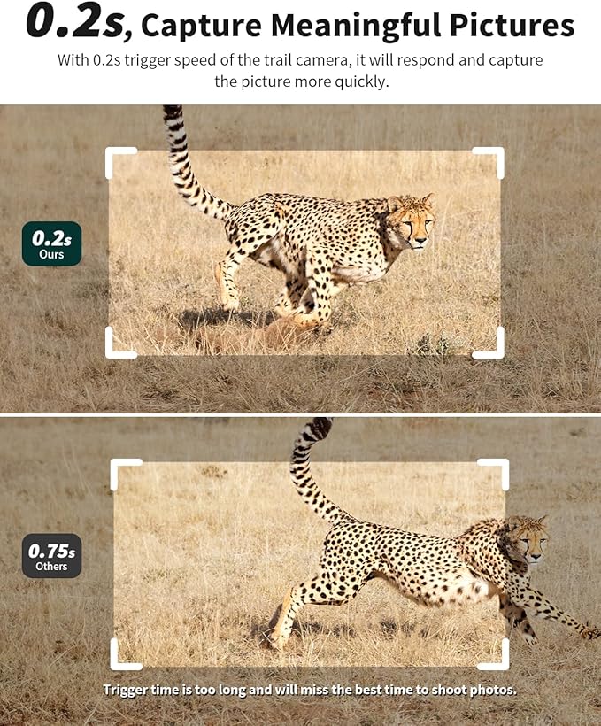 - 0.2S Trigger Time & Secure Storage -- 0.2S trigger speed, the solar trail camera captures precious moments. 2K high-definition image quality lets you see the animals. Optional storage methods- cloud storage or memory storage. You can save the image and videos to the memory card or cloud (30-day free trial).