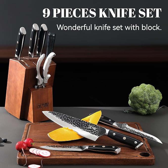 9 Pieces Knife Set with Block, Hand Forged High Carbon Steel Sharp Blade Cooking Knives Set with Holder for Kitchen, Block Chef Knife Set Professional, Best Gifts for Men Women