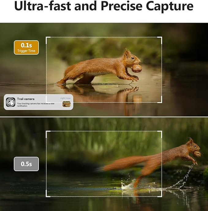 - 【Trail Cameras with Night Vision Motion Activated】Equipped with high-quality lenses and 3 PIR sensors and advanced 850nm infrared systems, our game cameras with Night Vision Motion Activated capbale for fast 0.1-second trigger time and wide 120° of view. With a night vision range of up to 56ft, you can vividly capture in all directions . Snap those split-second moments with breathtaking clarity, preserving every detail in lossless, high-definition brilliance.