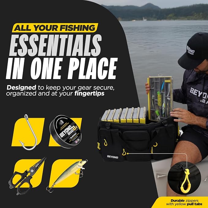 - BUILT FOR SERIOUS ANGLERS – High-visibility pull tabs allow easy one-finger access, and the rust-resistant self-healing zippers stand up to sand, salt, and daily use. Whether you’re loading up your truck bed or prepping in your garage, Beyond Braid tackle bags are made to go the distance.