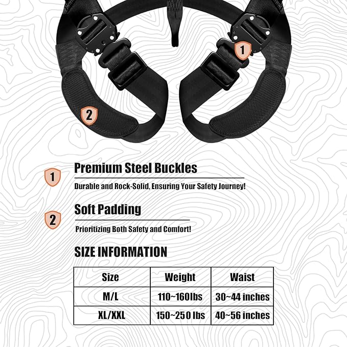 - DURABLE MATERIAL: Polyester Fabric (Pad cover), Premium upgraded safety harness, Comes Standard with Full Shoulder, Back, Waist, and Leg Comfort Padding, This lightweight, padded nylon safety harness features quiet, quick-release, cam leg buckles, as well as cinching, easy-adjust straps through the torso for a secure and easy-wearing fit.