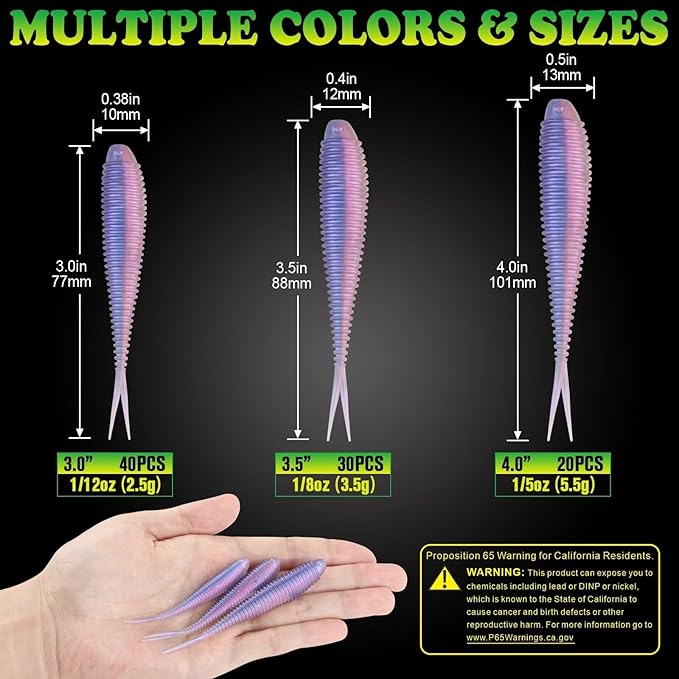• MULTIPLE COLORS & SIZES SOFT BAITS: Multiple sizes & colors to match any fishing condition. Size-Pcs: 3in-40pcs, 3.5in-30pcs, 4in-20pcs. Five Colors to Choose: Pearl white, Brown Magic, Morning Dawn, Green Flash, Purple Pearl. Whether you're targeting fish in stained, clear, or murky waters, the proven color options provide versatility for any condition. Carefully packaged to prevent deformation & preserve shape,which always keep soft bait perfect.