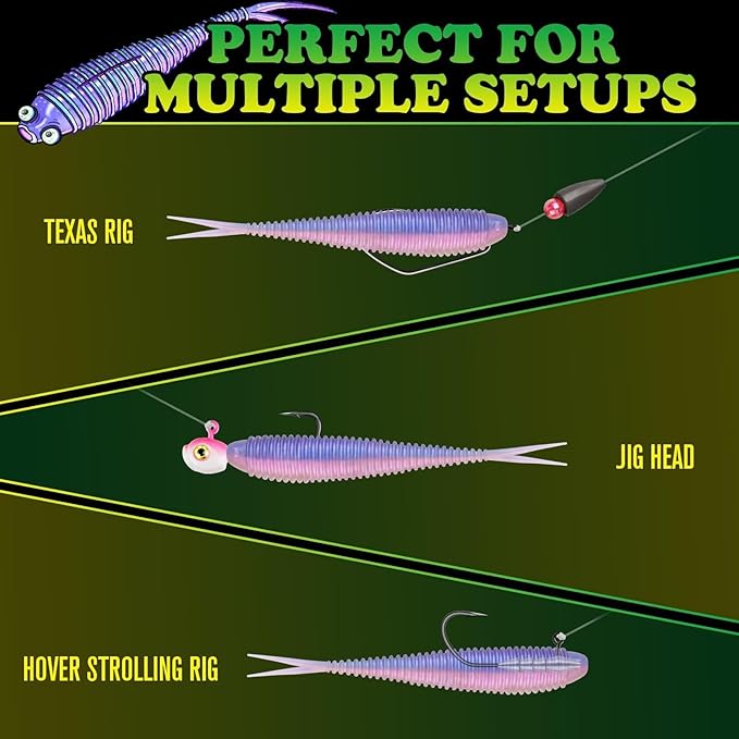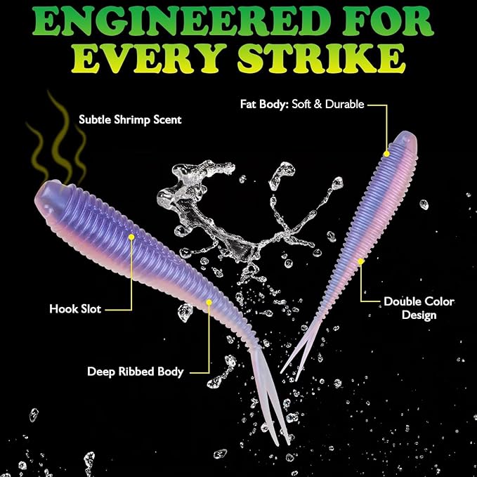 • UNIQUE INNOVATION RIBBED BODAY & FORKED TAIL: Soft Baits are Designed to Swim-Built to Catch. Innovation Deep Ribbed bodies that ripple vibrations through water, creating a tantalizing disturbance that draws fish in from afar. Natural Streamlined Baitfish Profile features a ribbed body design and lively forked tail to create a lifelike action. Slim forked tail adds lifelike motion, expertly mimicking the movements of baitfish while catching attention of even the wariest slabs.