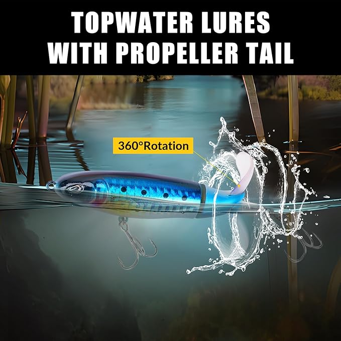 - 【Lifelike Fishing Lures】Elevate your fishing success with THKFISH lifelike topwater lures, engineered for maximum realism and durability. Experience the 3D-eyed swimbaits with irresistible S-wiggle action and precision-crafted surface tractors featuring 360° rotating propellers. These premium lures deliver exceptional performance trip after trip – making them the perfect long-term investment for your fishing adventures.
