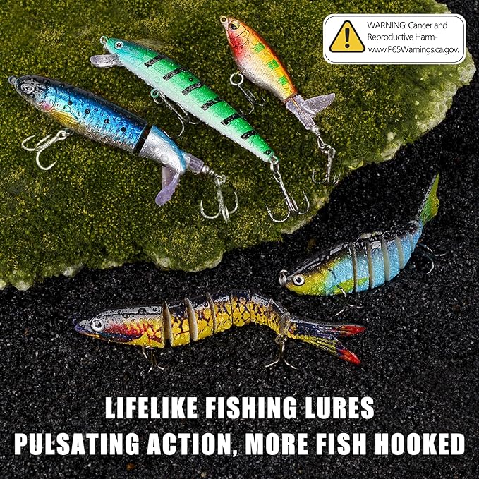 - 【Multi Fishing Lures Kits】The topwater fishing lures kit includes 9pcs Multi-jointed baits, 3pcs Minnows, 2 Pencils, 2 Poppers, 1pcs Frog, 6pcs Surface Tractors and 5pcs Crankbaits. Offering a diverse selection of expertly crafted hard baits in multiple sizes and vibrant colors, suitable for Bass Pike Panfish Walleye Trout Crappie in both freshwater and saltwater environments.