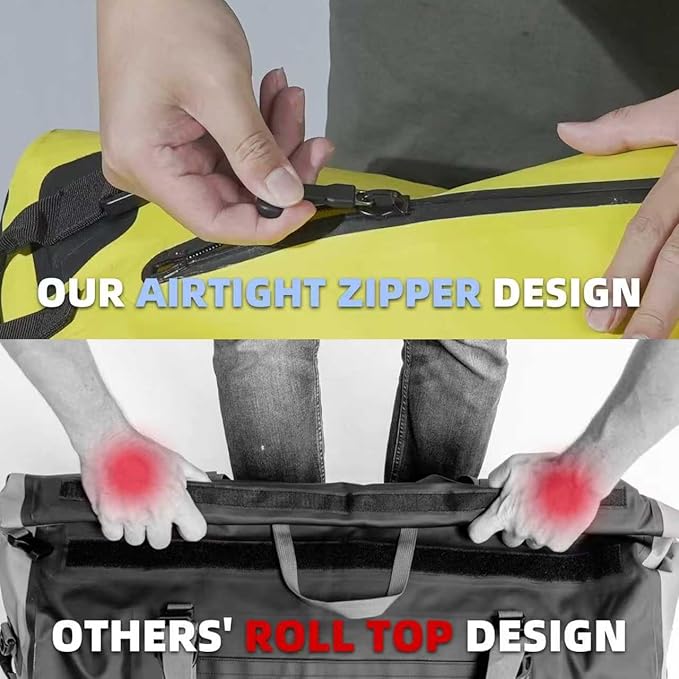 - Multi-Purpose Adventure Gear - As a marine dry bags alternative to traditional roll-top designs, this large waterproof bag features an innovative airtight zipper for superior sealing—just zip it up for instant, reliable airtight protection without the hassle of rolling. Suits campers, motorcyclists, and water sports enthusiasts; perfect for kayaking, rafting, boating, fishing, or car roof storage—handles sand, terrain, and travel with ease