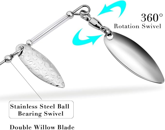 - SPINNERS BAIT FEATURES - Double willow blade combinations enhance flash and vibration, life-like swimming actions in water and colorful 50 strand silicone skirt to be attractive for predators to bite