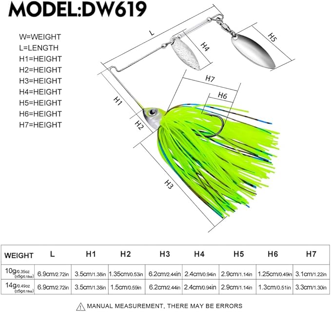 - SPINNERBAIT LURES - Simulation fish head with extra large 3D vivid eyes, flared gills and hard coat paint, the lure undulating skirt attract fish. Weight: 14g/0.5oz. Diving Depth: all swimming layer