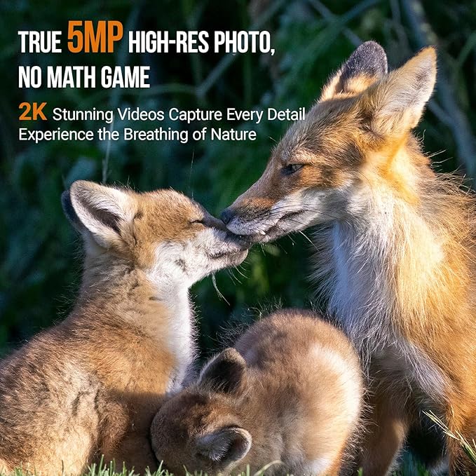 - No-Glow Infrared Night Vision: Invisible to wildlife, our 940nm no-glow IR technology captures crystal-clear night footage without spooking your targets, so you'll get undisturbed and natural behavior in their habitat. This hidden camera triggers in just 0.3 seconds with a range of up to 92 feet (28 meters). It snaps 5MP stills and records 2K audio-enabled videos, bringing the vivid world of wildlife to life.